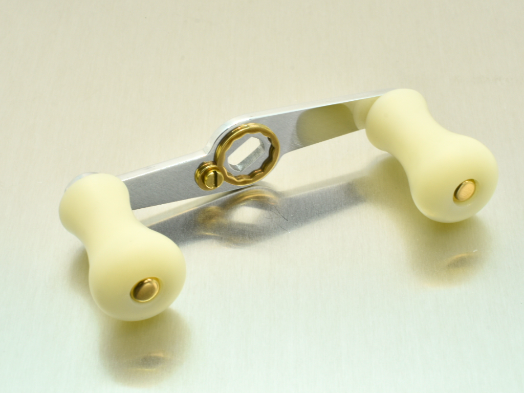 プレート部分は軽量かつ強度に優れた超々ジュラルミンA7075。加工難易度も高く、素材自体も高価ですが、製作工程の自前化により採用する事ができました。そして、ハンドルピラーには真鍮素材を採用。ハンドルを回転させた際の重心バランスを最適化することで、ノブが指に吸い付くような巻き心地を目指しました。