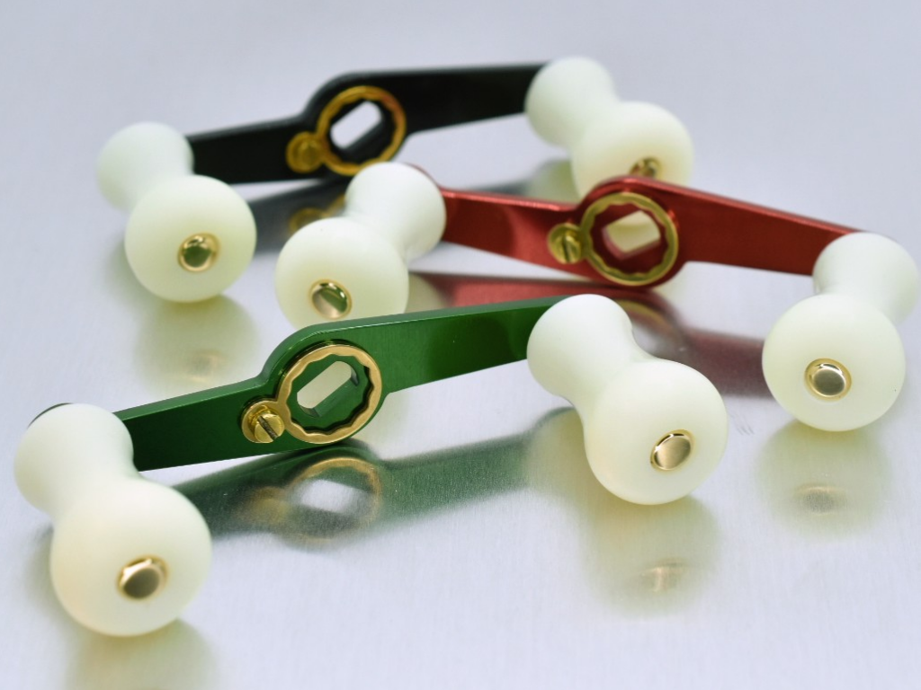 レッドとグリーンのカラーアルマイト処理を施したハンドルです。