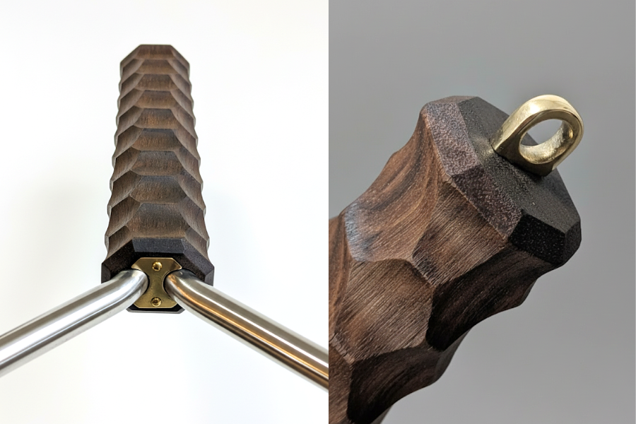 グリップエンドの真鍮パーツには、釣り人の好みでリーシュコード等を取り付ける事も可能です。また、フレームとの接合部分に取り付けられたパーツは”アルミ×真鍮×銘木”それぞれの質感を際立たせながら全体としてのデザインの調和を図る為のもので、どちらも既製品ではなく素材から削り出して作成しているオリジナルパーツです。