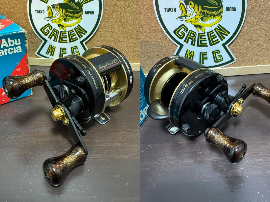 こちらの 「Royal Gold LE」というリールは初めて知ったのですが、80年末~90年代頭のアンバサダーにCDLのような豪華な雰囲気が混じっていてカッコイイ!あまり見かけないモデルだと思いますが、このリールを選ぶセンスも最高です。艶ありブラックのボディに、艶ありのブラックアルマイト仕上げがいい感じですね😍